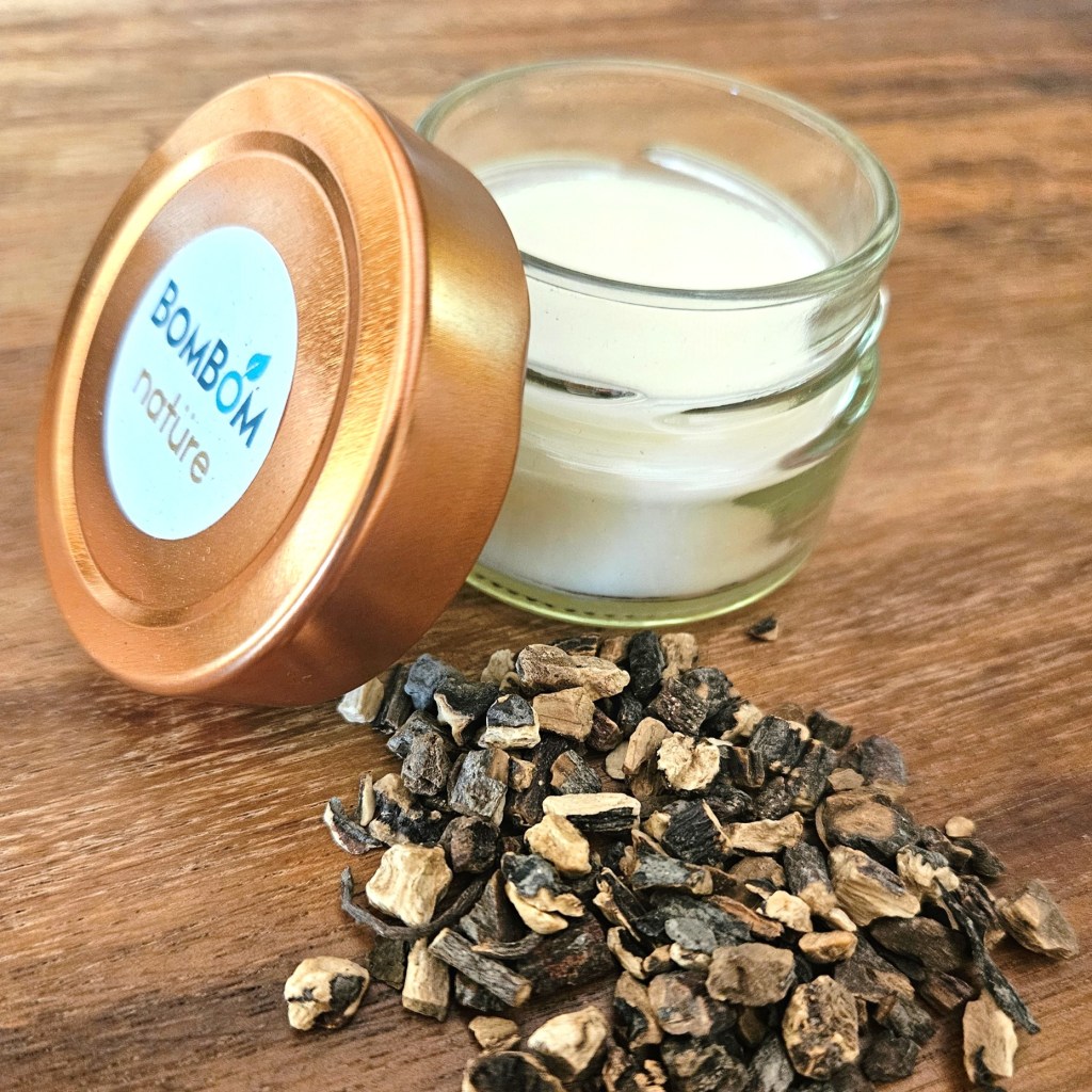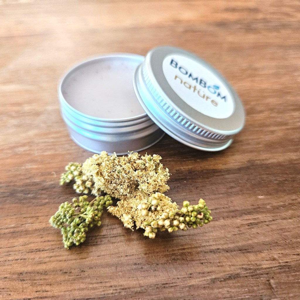 Ingrédients : macérât oléique de fleurs de reine-des-prés, huile de coco bio, cire d’abeille bio, poudre de pétales de roses, huile essentielle d’orange bio, conservateur naturel (vitamine E).