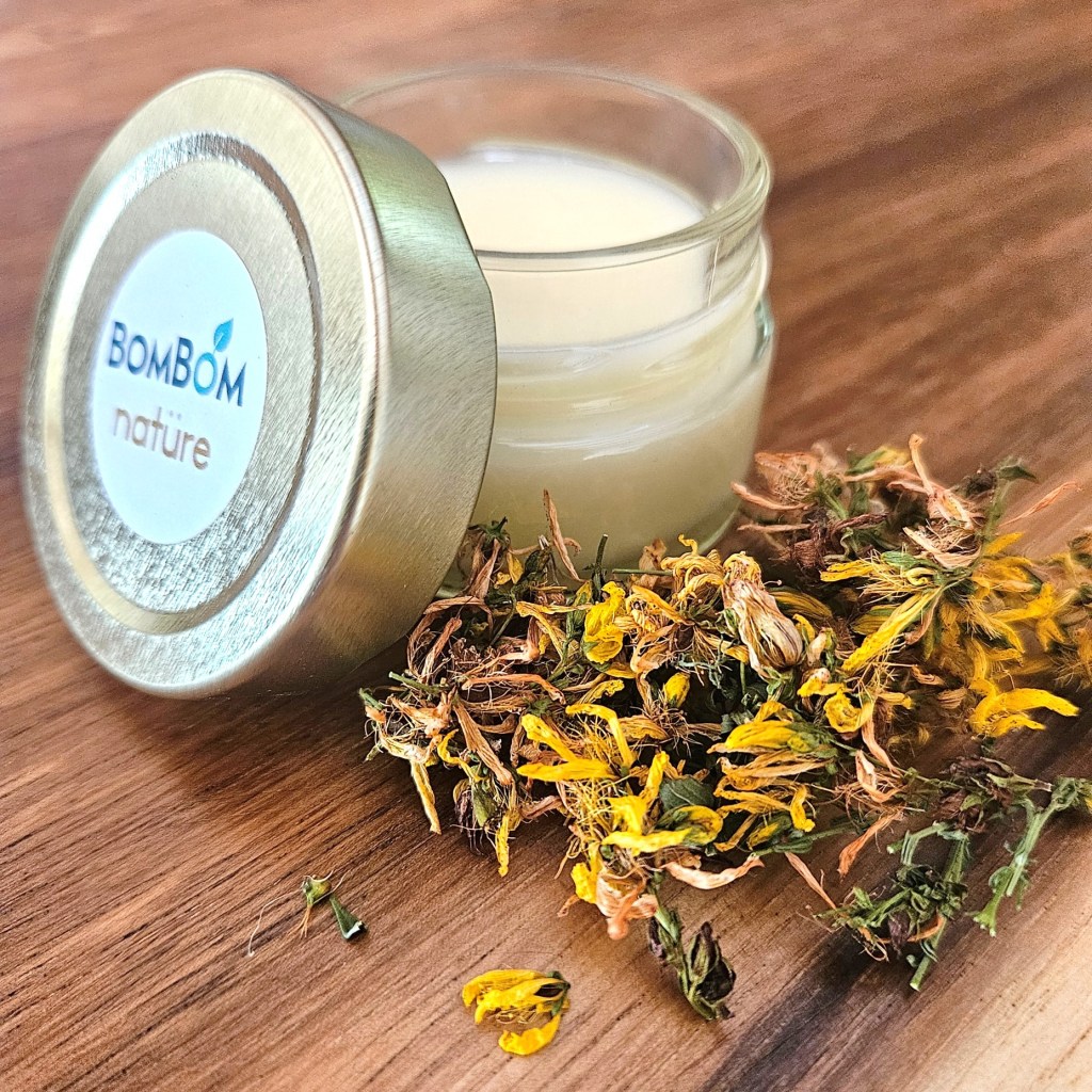 Ingrédients : macérât oléique de fleurs de millepertuis, huile de coco bio, cire d’abeille bio, huile de jojoba bio, huile essentielle de romarin, conservateur naturel (vitamine E).